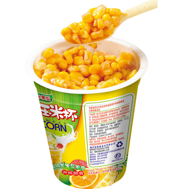 产品简介:来自绿色生态农庄非转基因粗纤维健康膳食、出口品质休闲美食、水果型甜玉米杯。本产品为引进国外优质甜玉米品种,自营基地栽培,采用先进工艺精制而成,杯内袋装甜玉米绝无任何添加剂,食品卫生安全要求符合中国出口商品检验检疫标准!目前有三种风味可供选择:香甜沙拉、苹果味、草莓味!该产品清甜爽口,实为旅游、休闲、娱乐及点心之佳品。